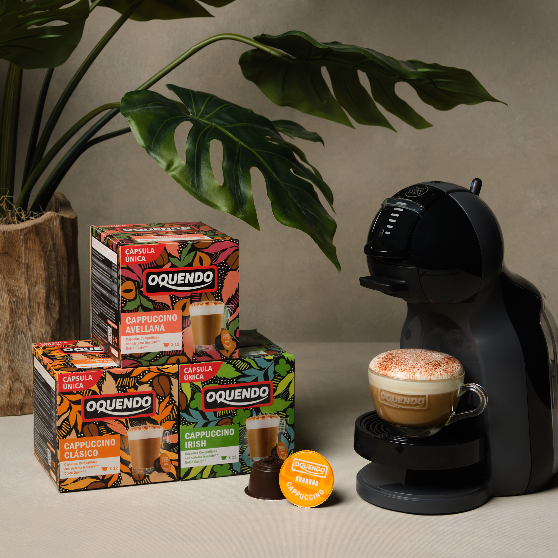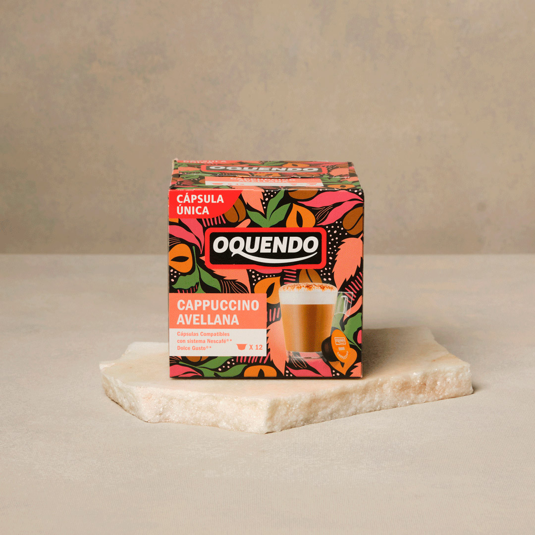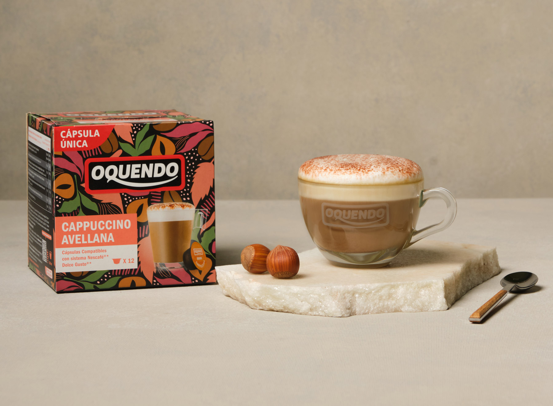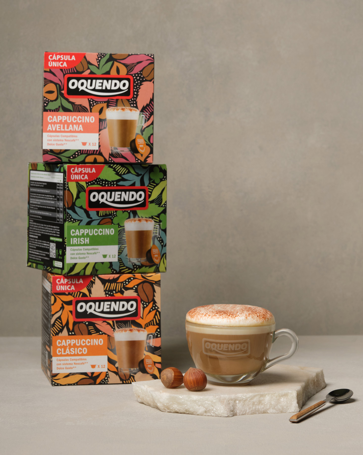 For the redesign of Oquendo’s cappuccino range packaging, the goal was to create a vibrant, contemporary, and instantly recognizable image on the shelf. We developed a graphic system that conveys energy, flavor, and personality—aligned with an indulgent, everyday coffee experience. The visual language is built around organic illustrations, featuring leaves and coffee beans that surround the product in a dynamic, colorful style.