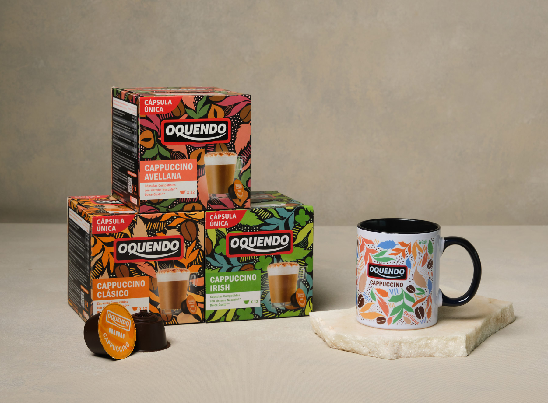 Cappuccino packaging for Oquendo based on illustration and color, with a bold, vibrant, and highly recognizable visual identity.