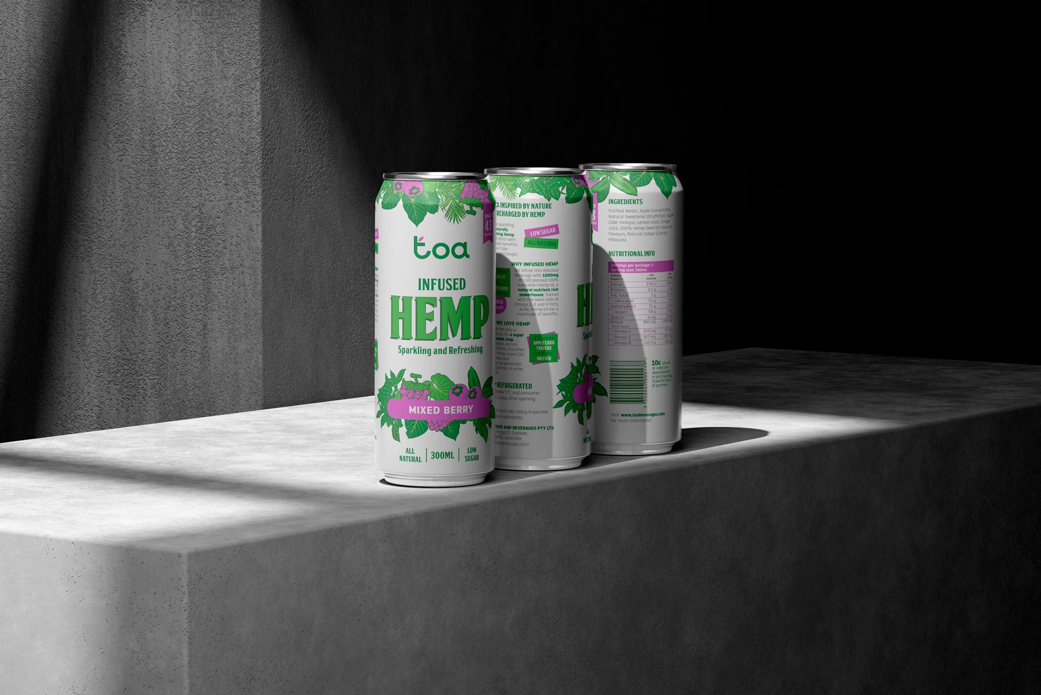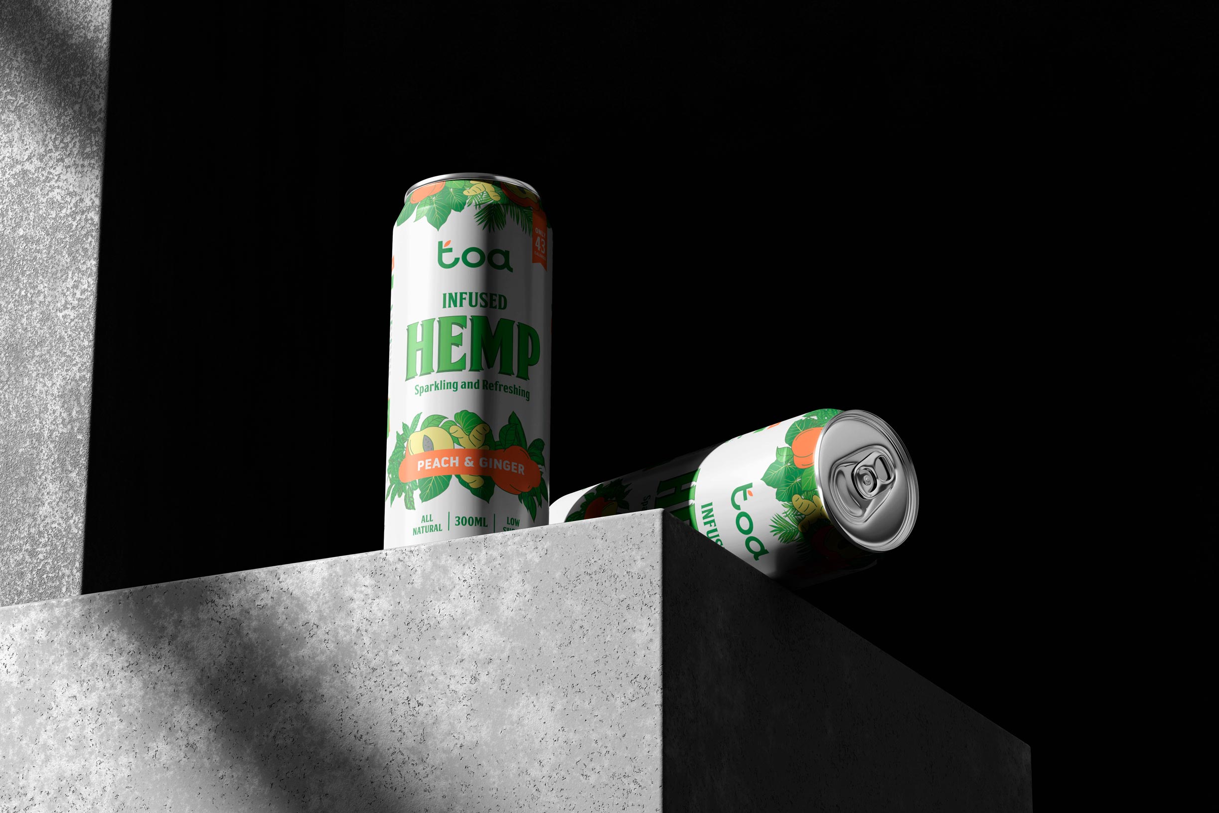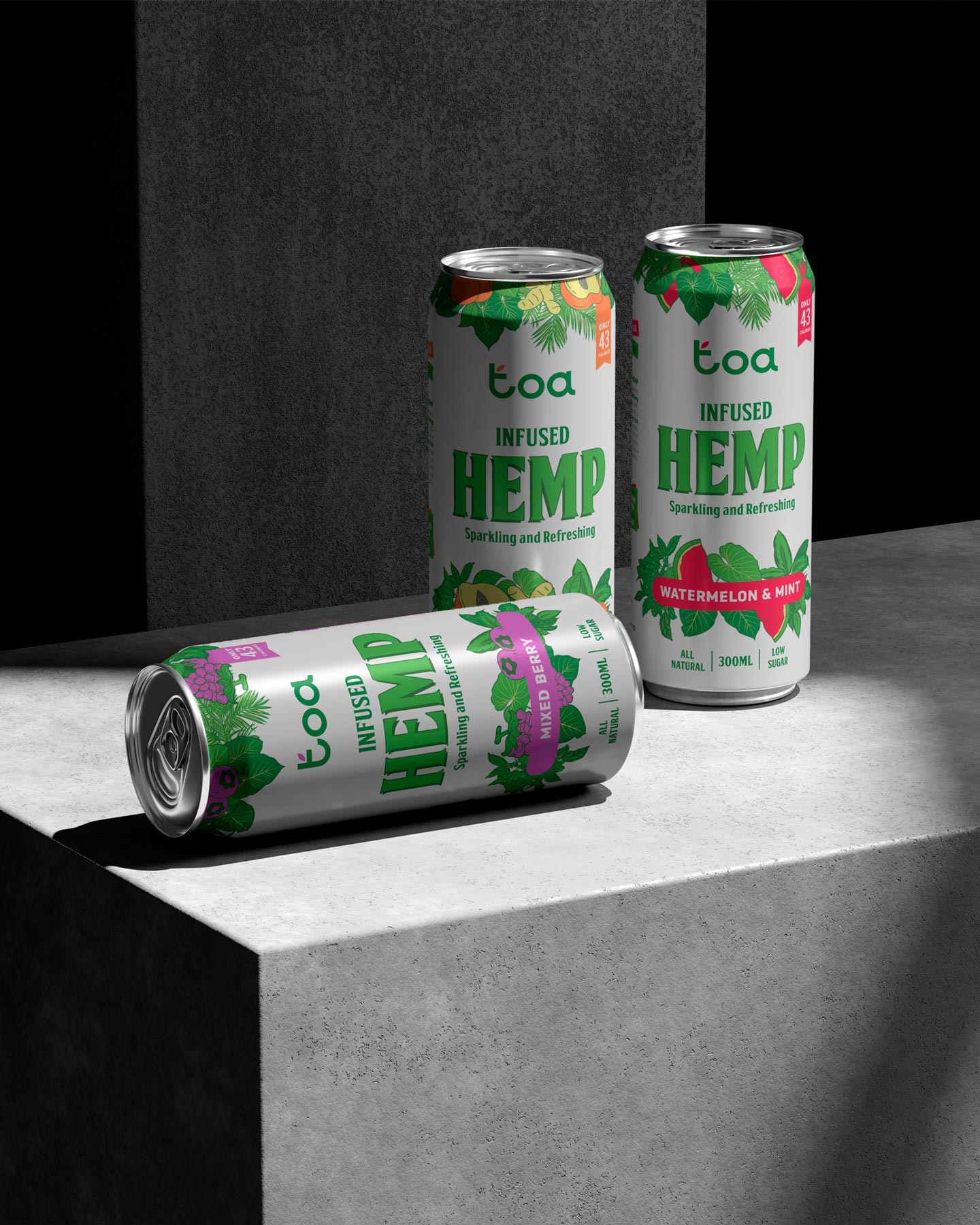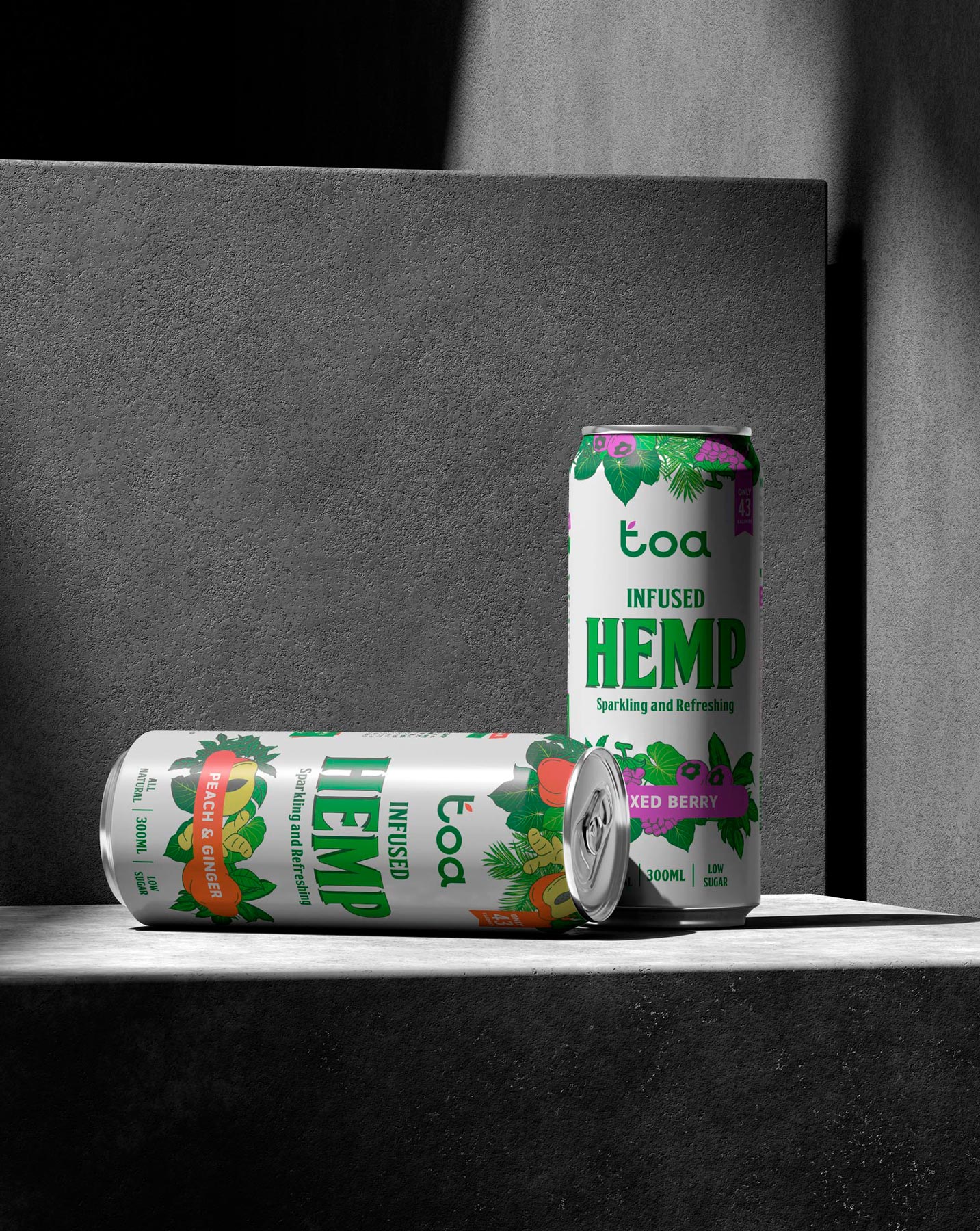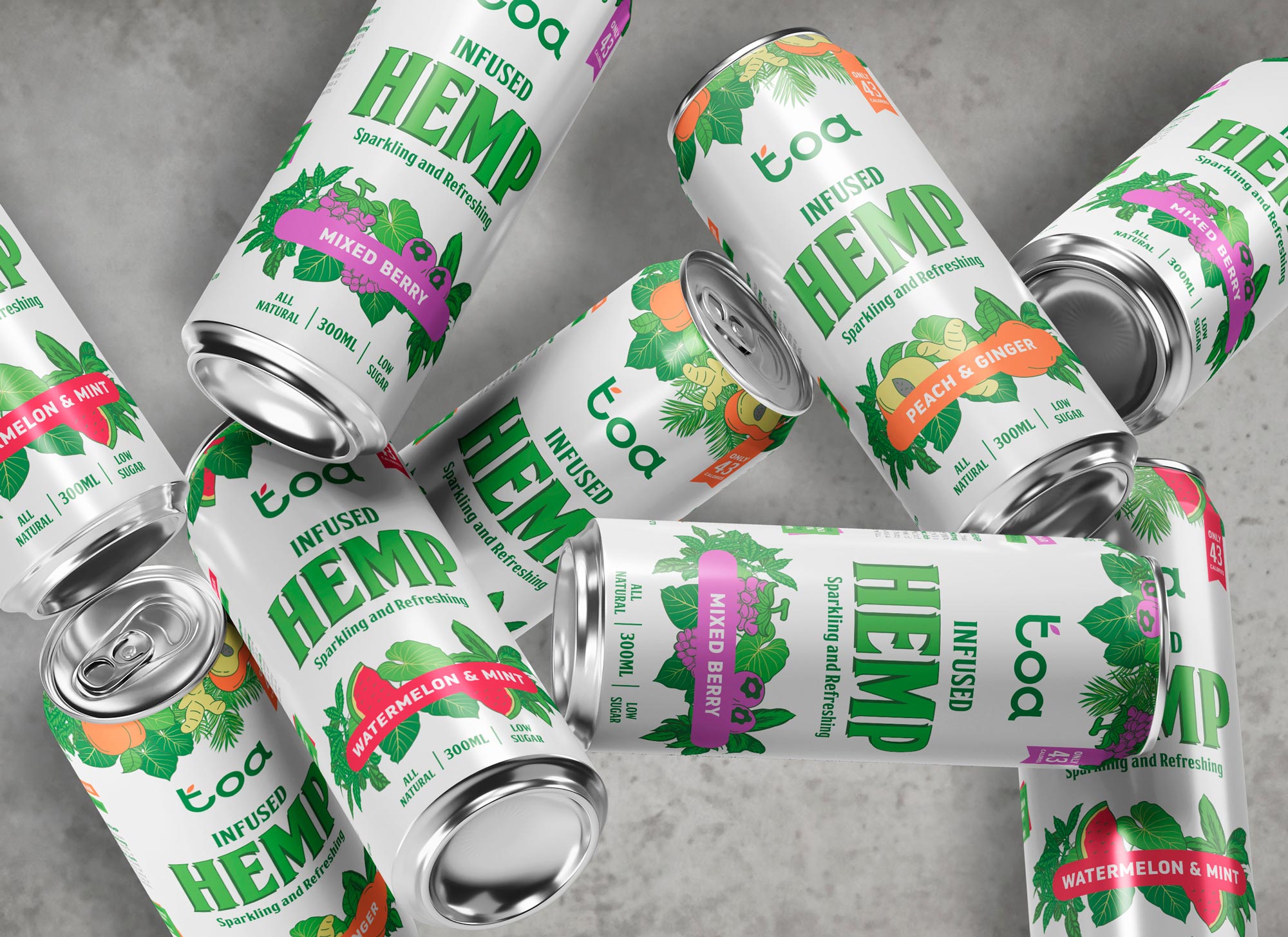 Para el desarrollo de la identidad visual y el diseño de packaging de Toa Hemp, una bebida refrescante con infusión de cáñamo, nos propusimos construir una marca que transmitiera vitalidad, naturalidad y una actitud moderna, sin perder de vista la funcionalidad clara del producto en el lineal.